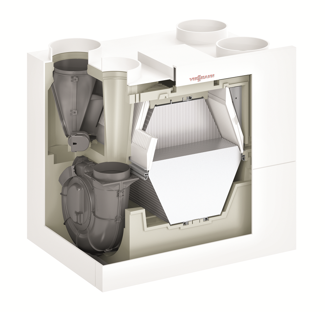 Wiszący rekuperator z wymiennikiem krzyżowo-przeciwprądowym, sterowany